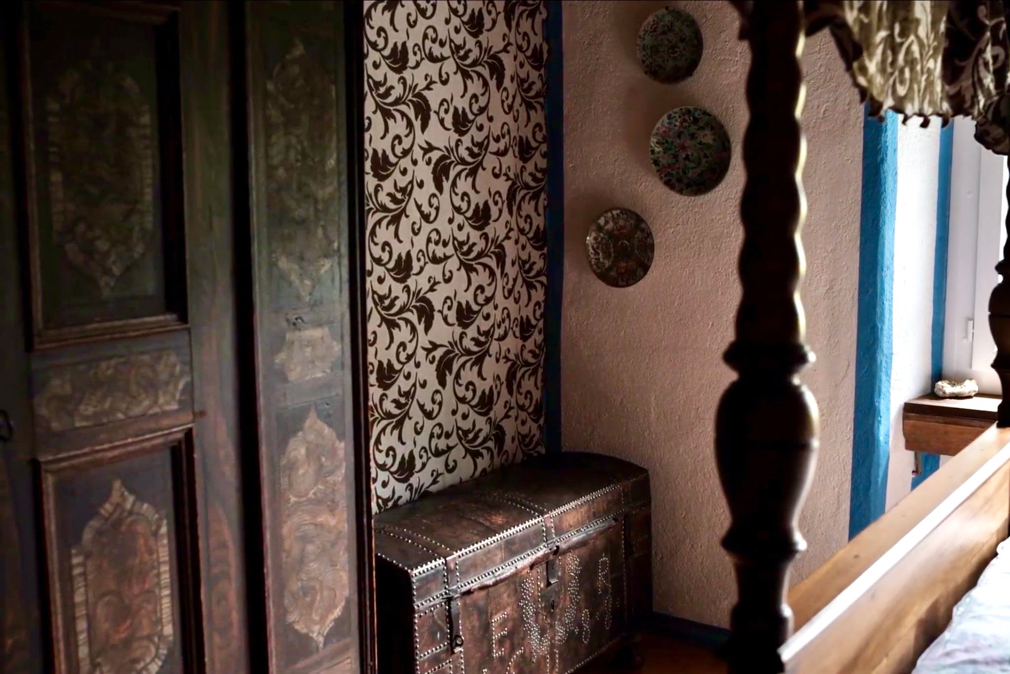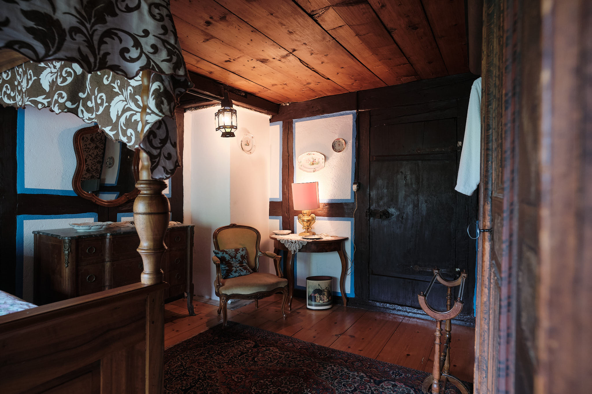 Ein prächtiger Barockschrank um 1730 ist ein seltenes Exemplar der Glarner Möbelbaukunst, bemalt mit einer speziellen Technik in Brauntönen. Die Reisetruhe aus dem Kanton Graubünden geht auf das Jahr 1688 zurück, natürlich auch im Originalzustand. An den Wänden finden sich auch hier alte Porzellanteller.