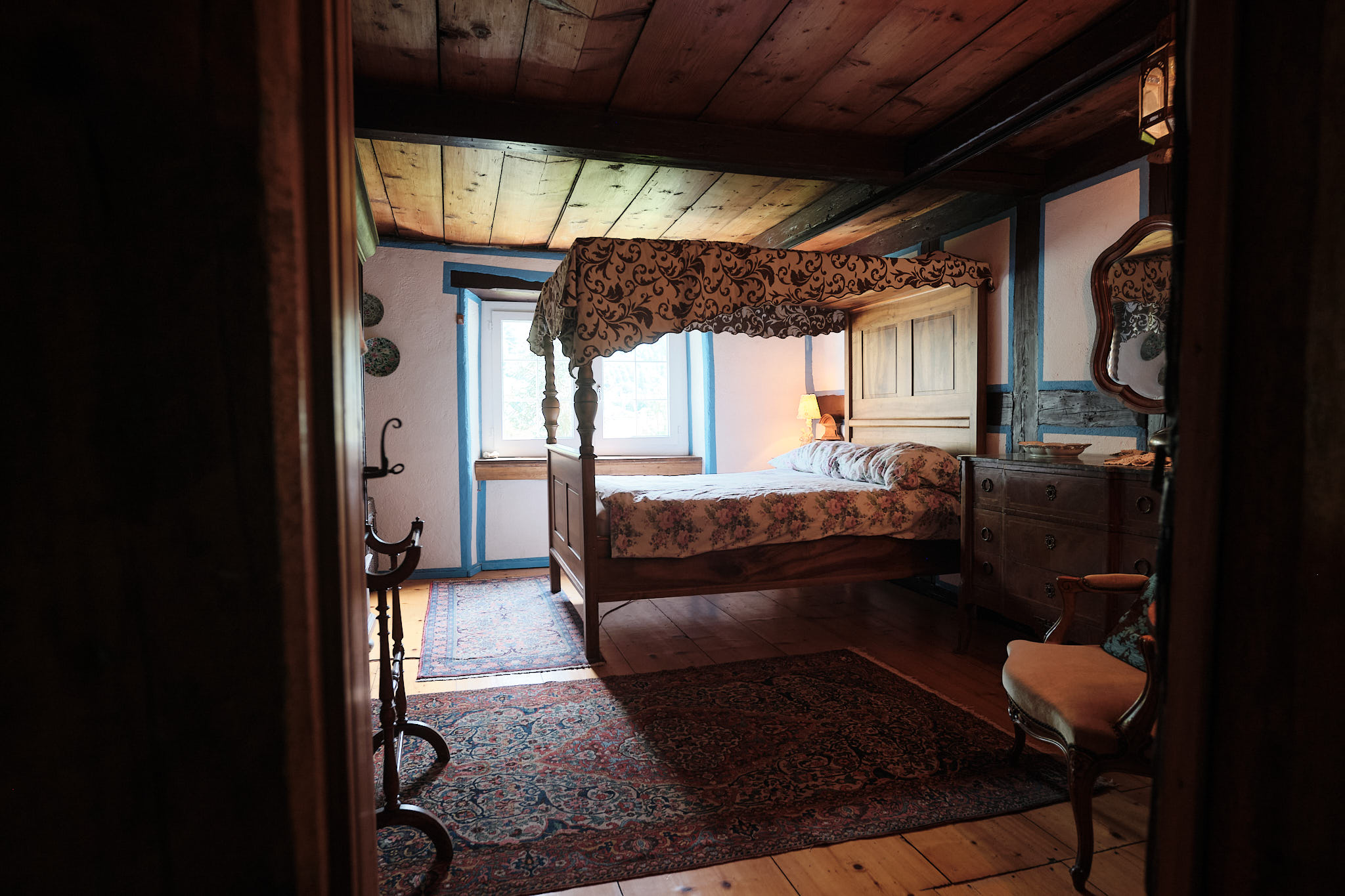 Das massive Bett aus Nussbaumholz ist ein besonders schön geschaffenes Möbelstück, eine Schenkung aus der ansehnlichen Sammlung von Frau Dr. Elisabeth Sprüngli-Halter, die das Landvogthaus wegen seiner gut erhaltenen Ursprünglichkeit stets sehr schätzte.